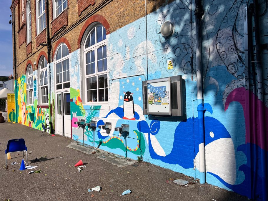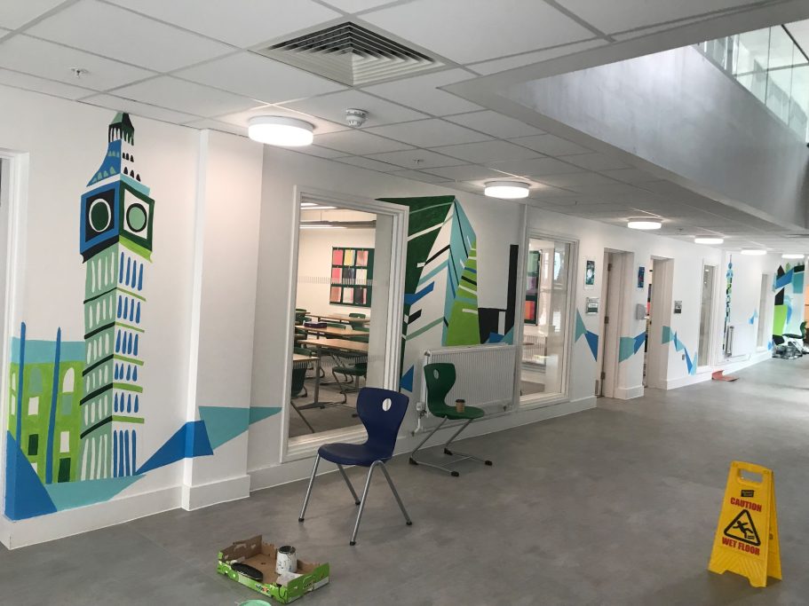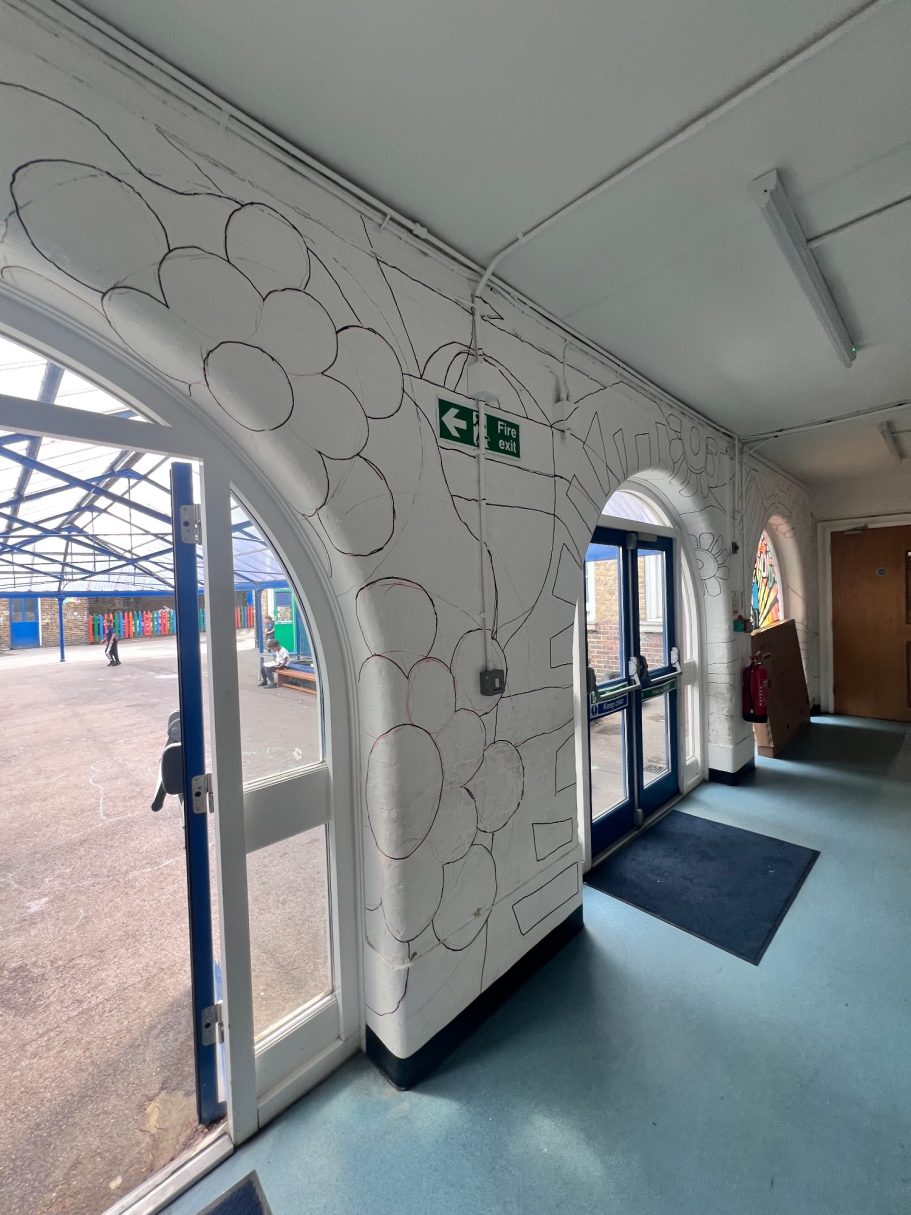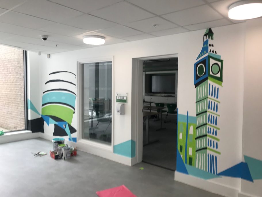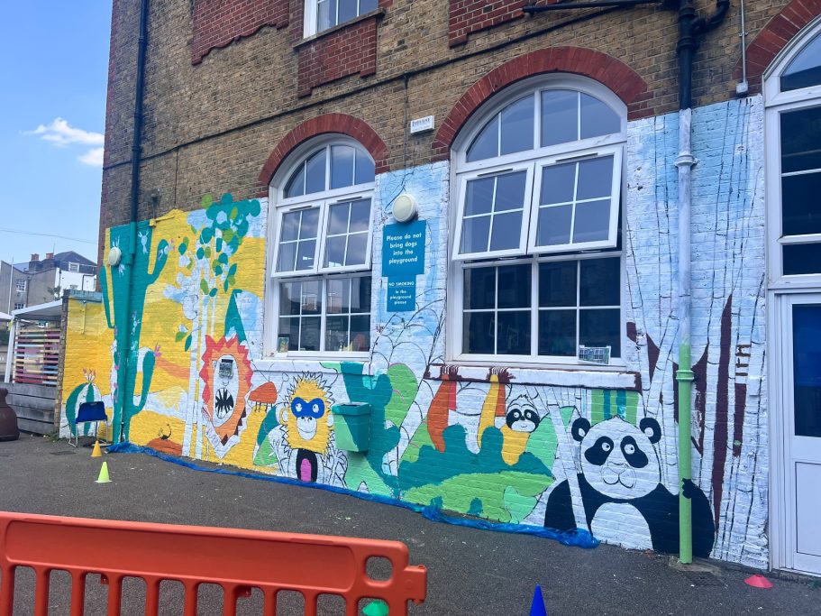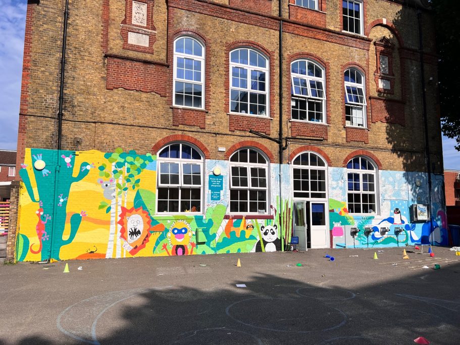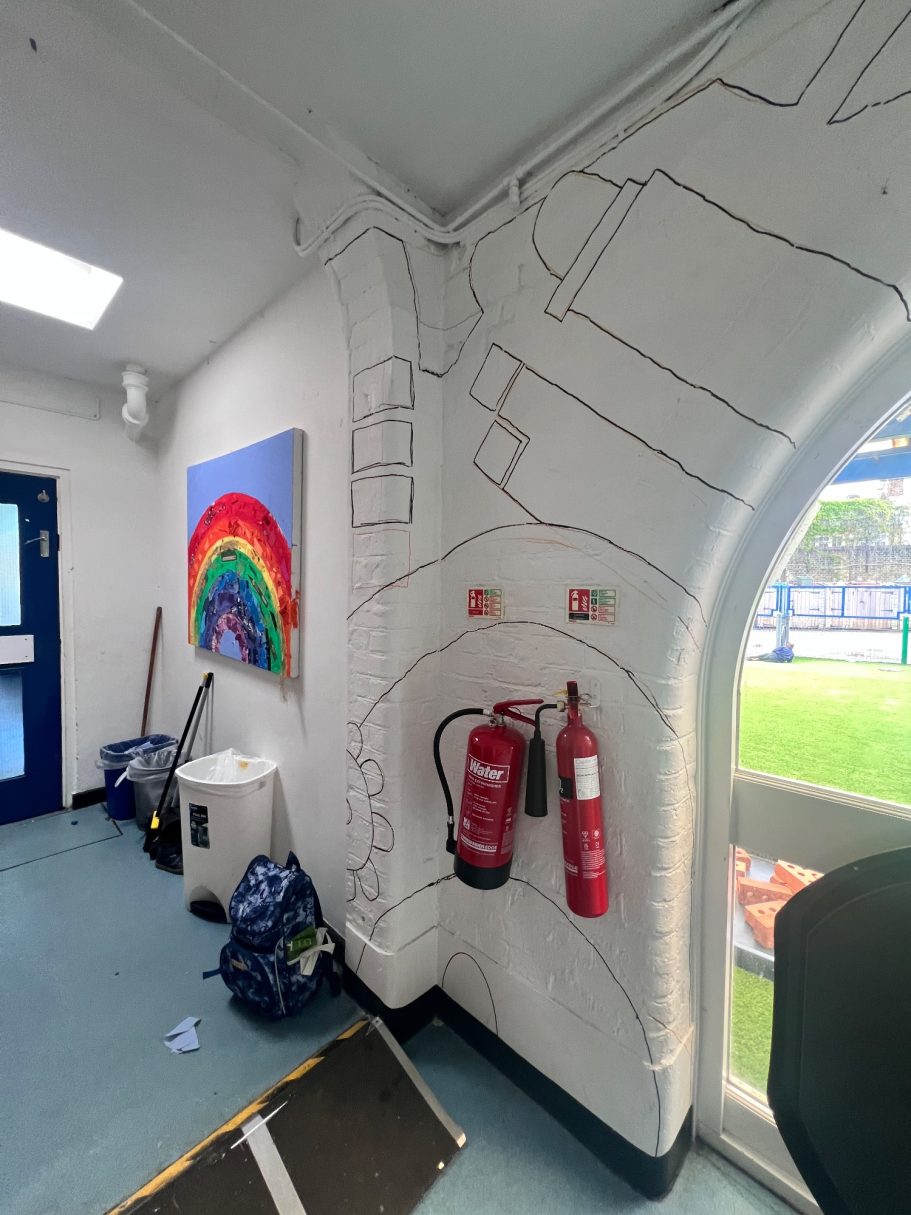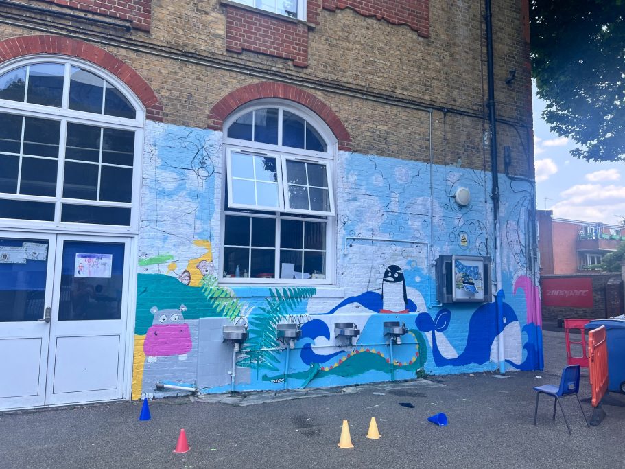 I was super excited to be working with James Wolfe Primary school on this new project. I worked with year 2 students drawing in Greenwich to come up with the initial ideas and then lead workshops back at school to design the final mural. I then painted the mural on the wall to transform the space.