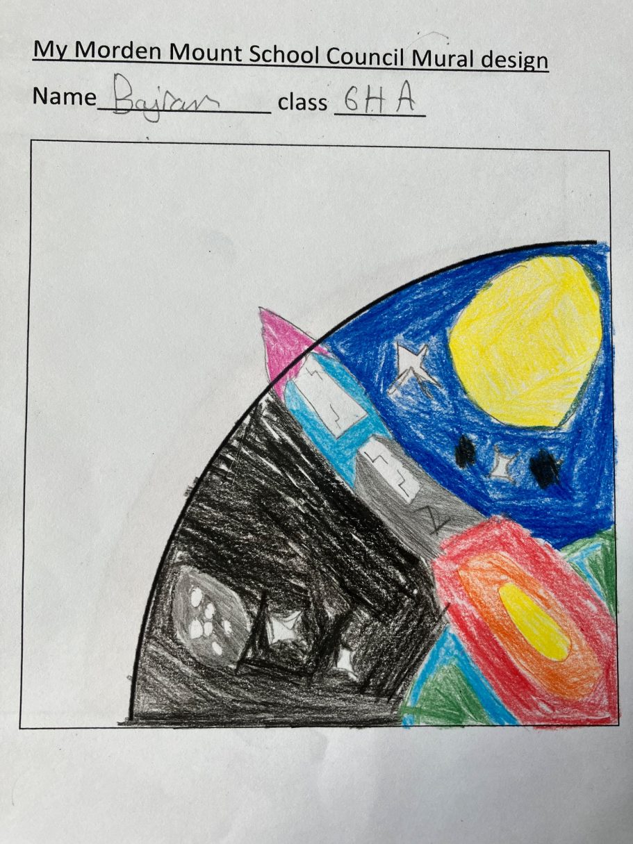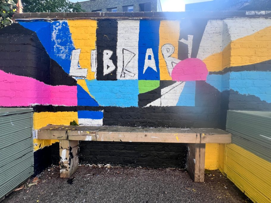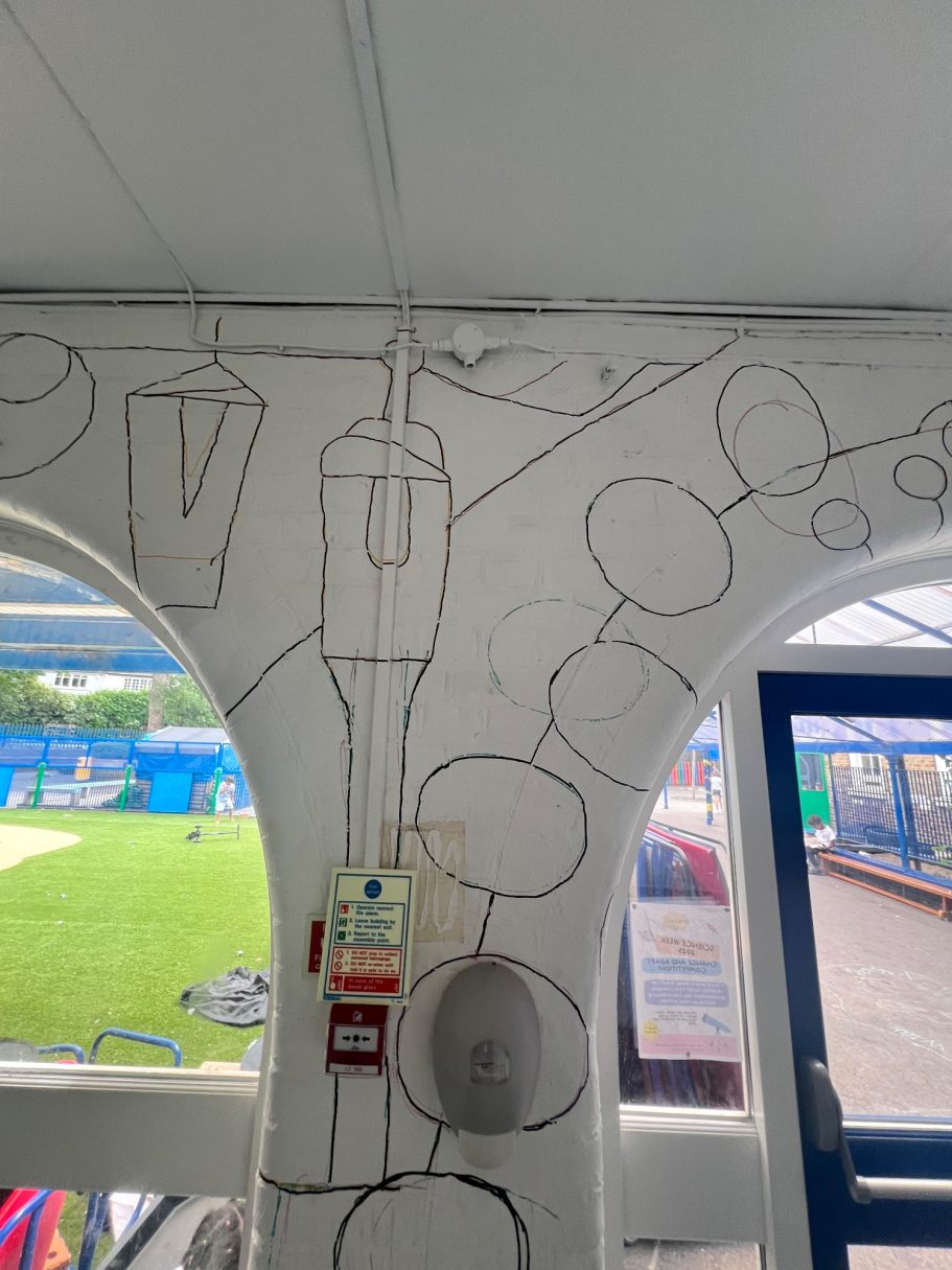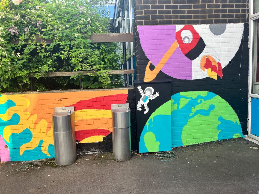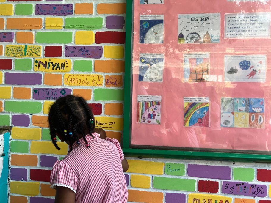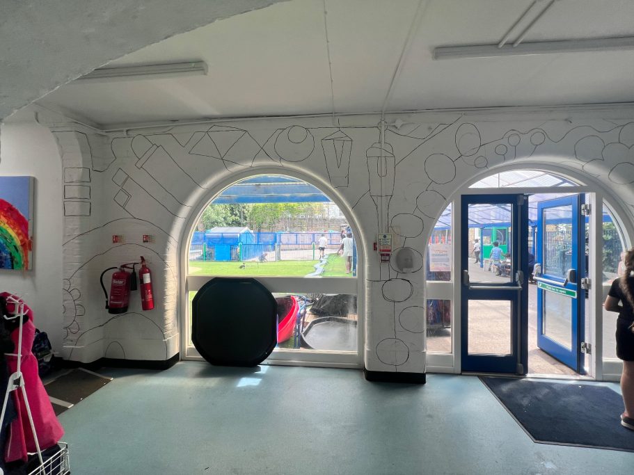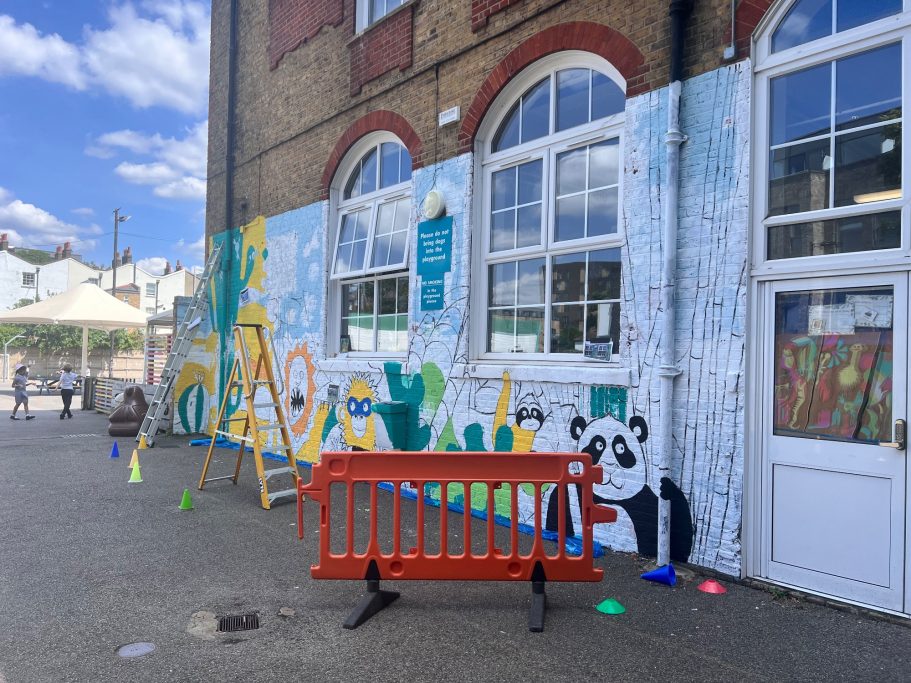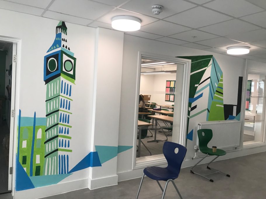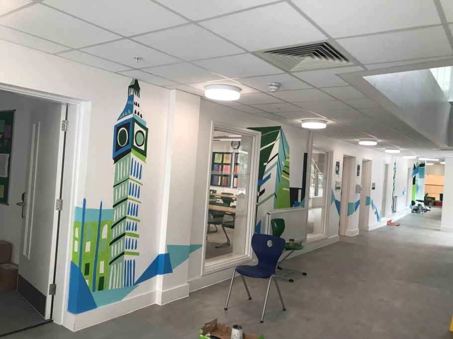 I was super excited to be working with James Wolfe Primary school on this new project. I worked with year 2 students drawing in Greenwich to come up with the initial ideas and then lead workshops back at school to design the final mural. I then painted the mural on the wall to transform the space.