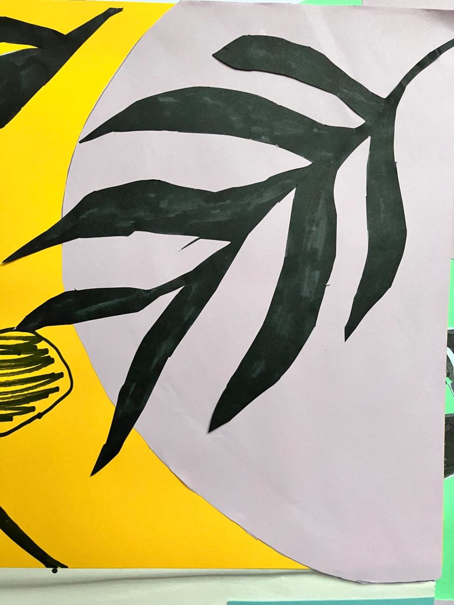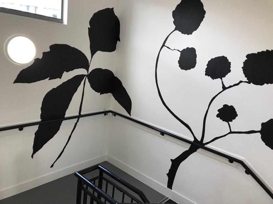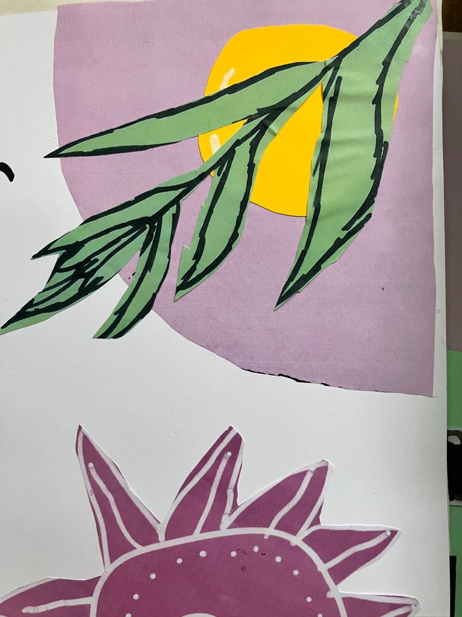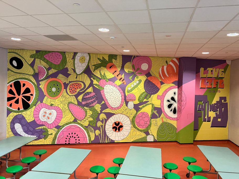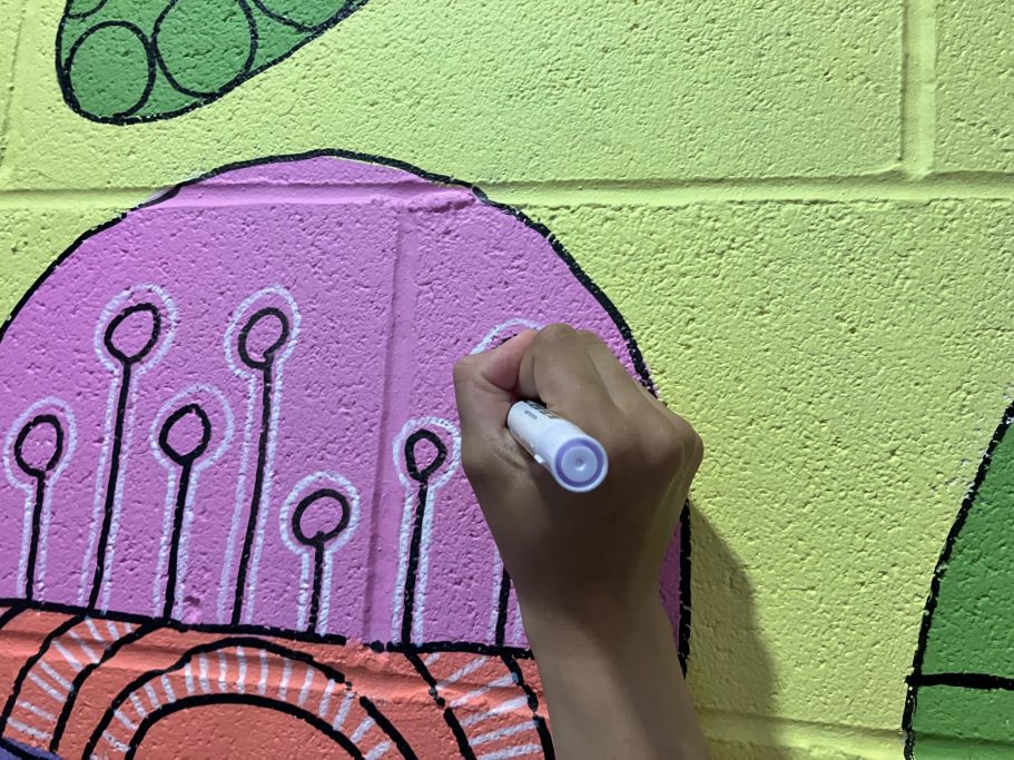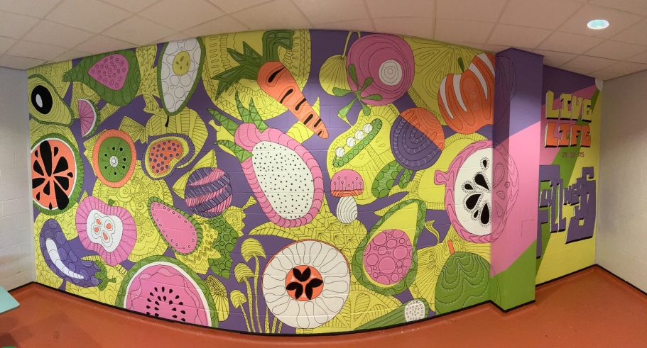 The Mural is taking native plants from the year 5's cultural heritage and using the colours from the school house system. A beautiful colour palatte of Yellow, Green, Blue and Purple.