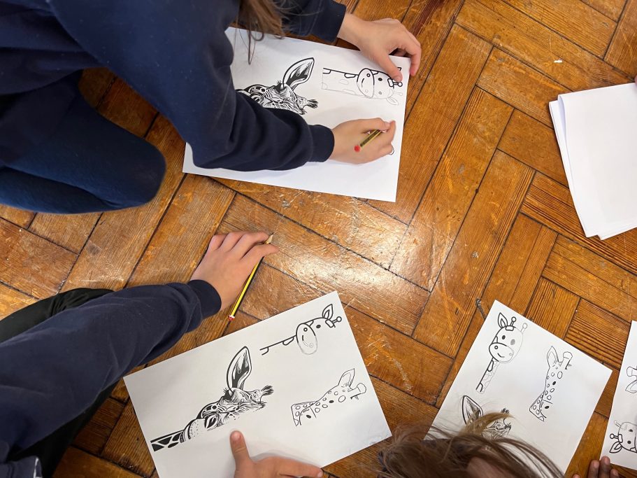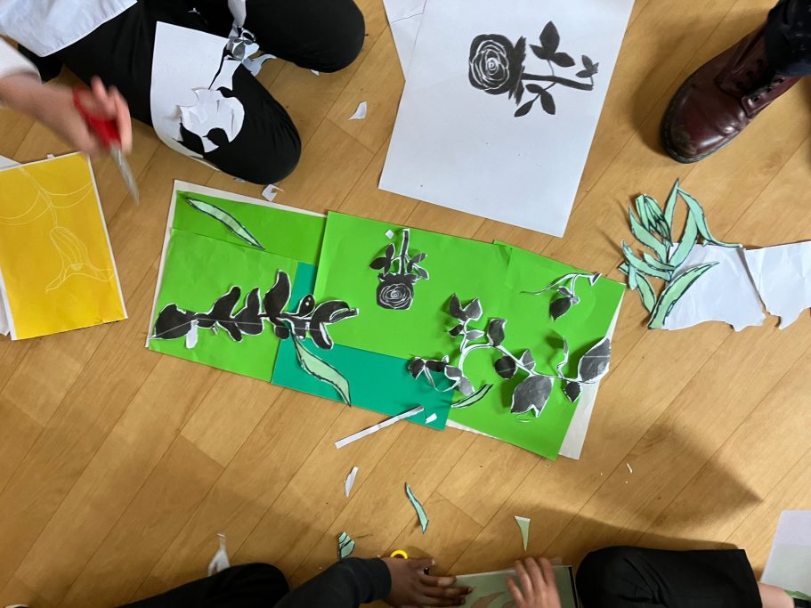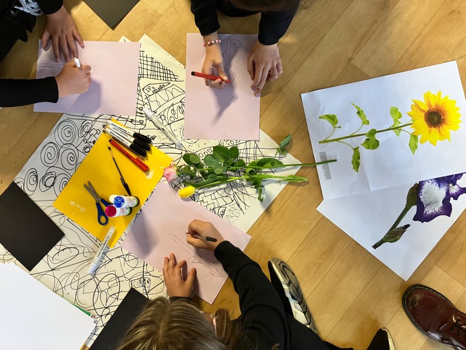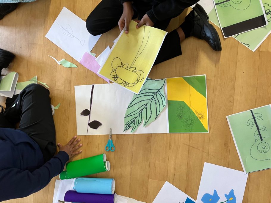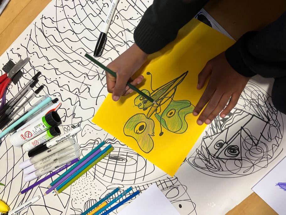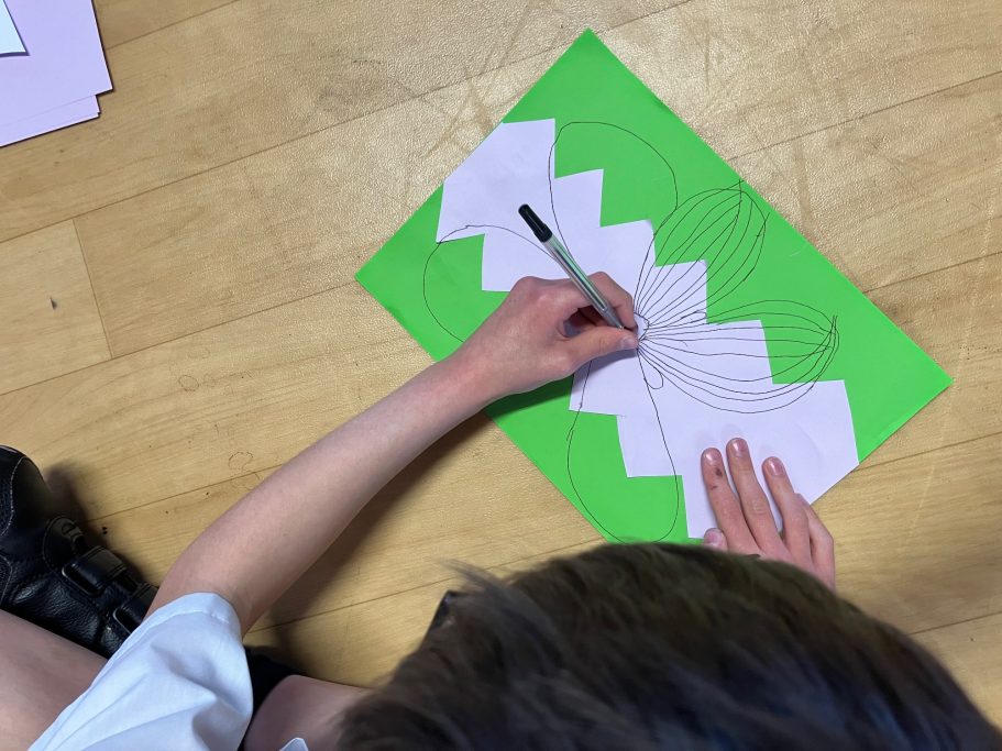 Here you can see the pupils in action during the workshop, some of their finished designs and how I have turned those designs into the final mural.