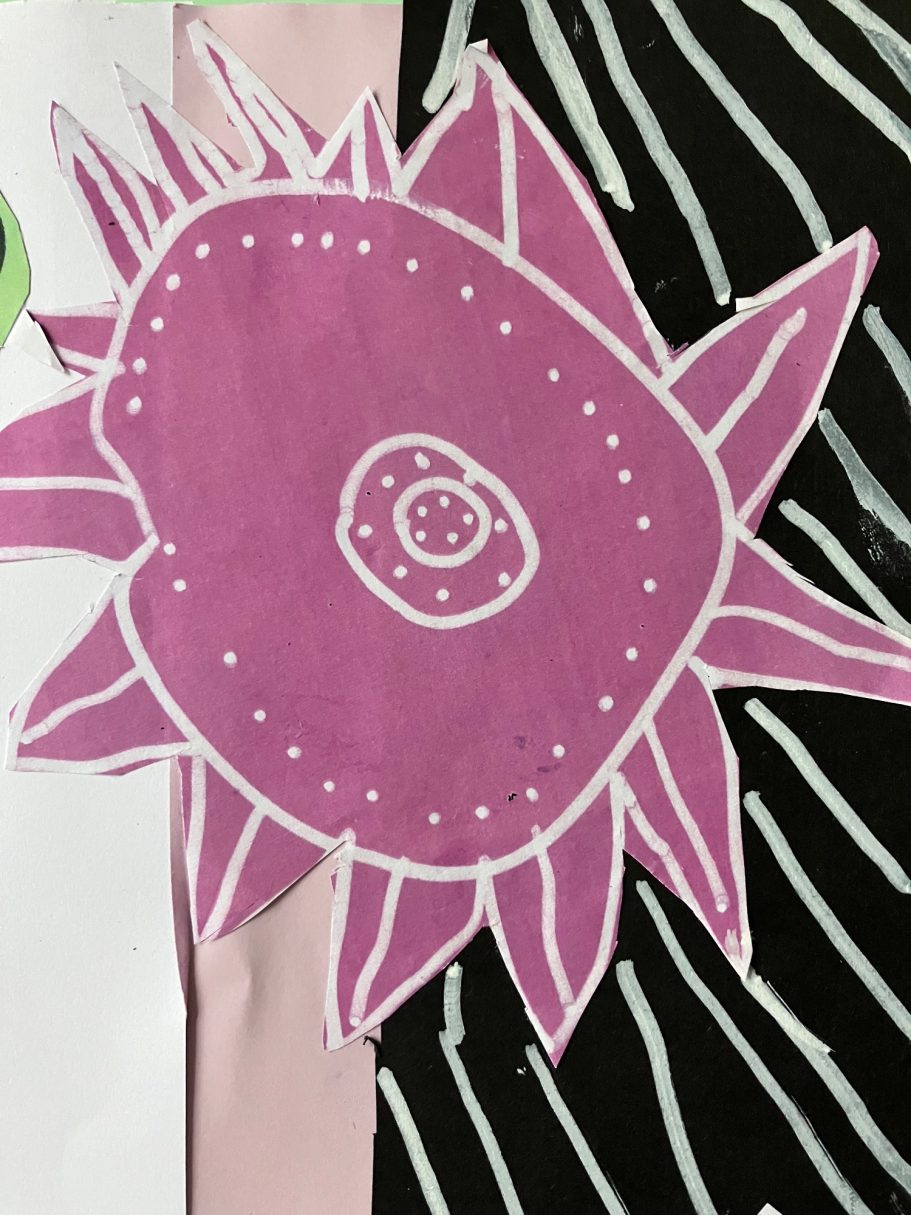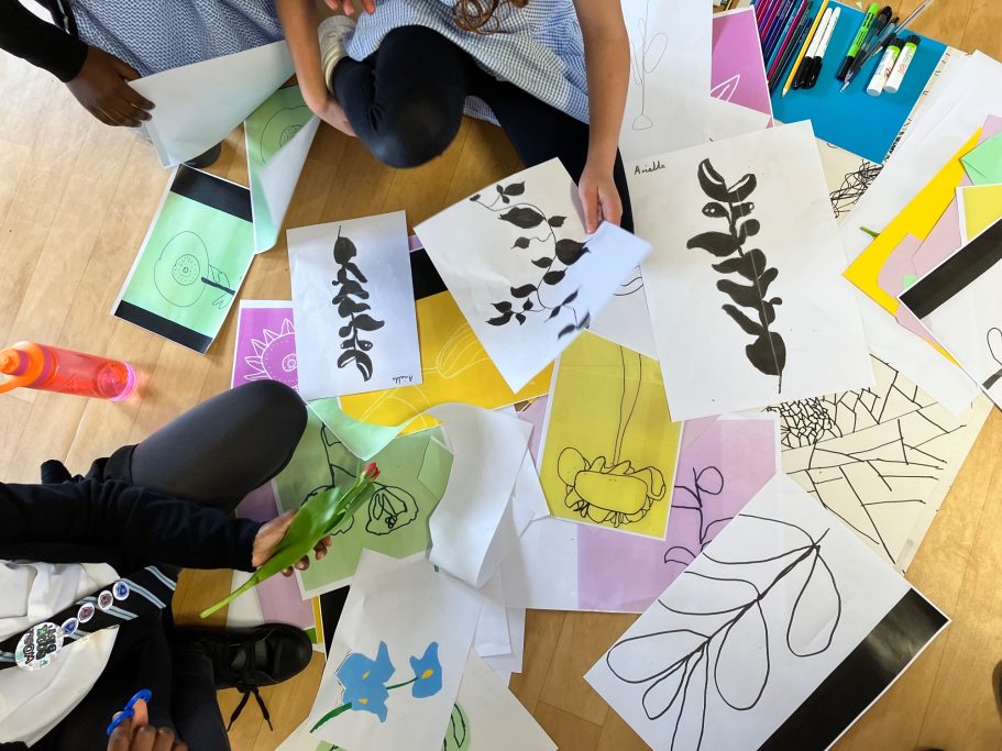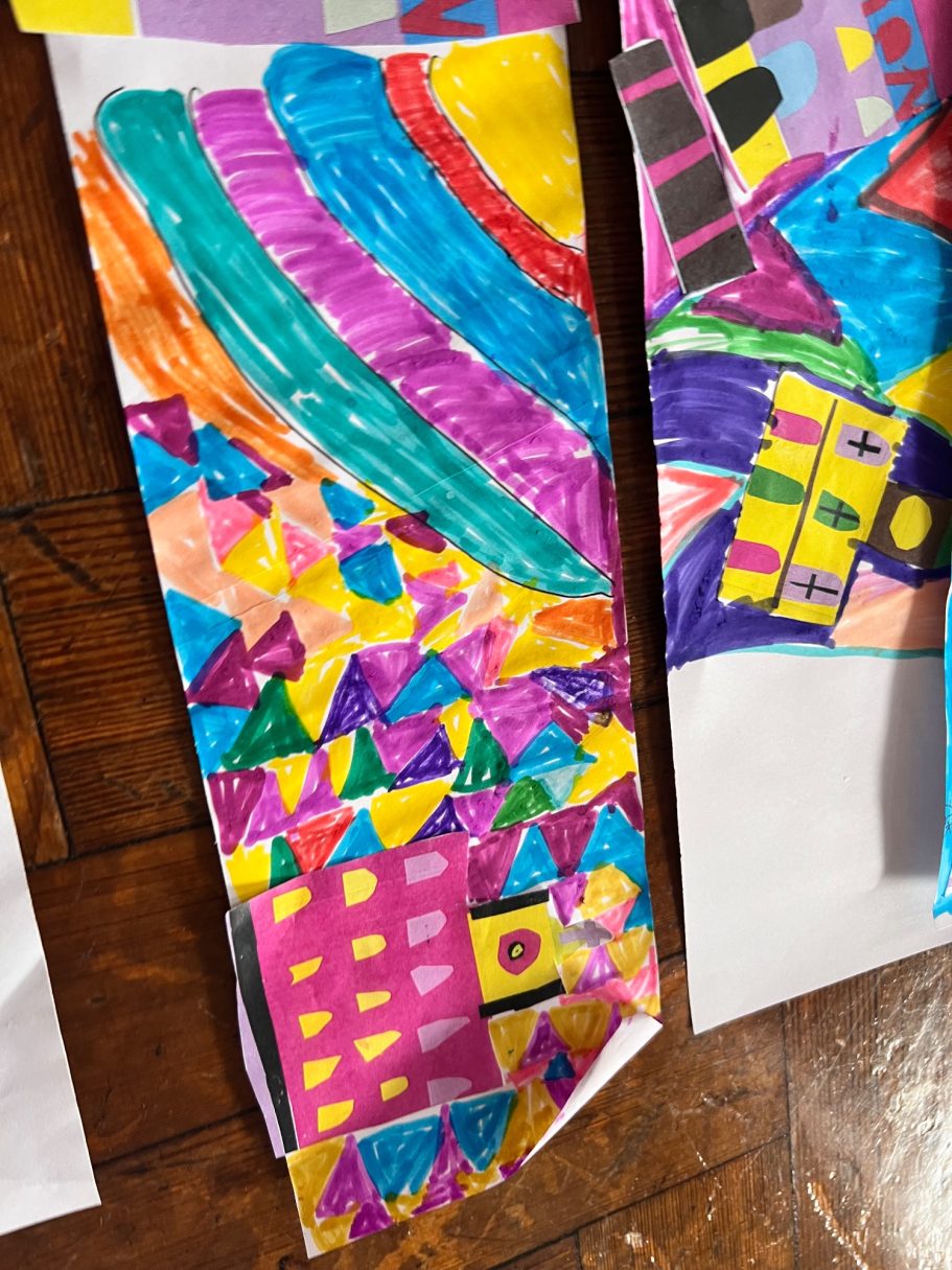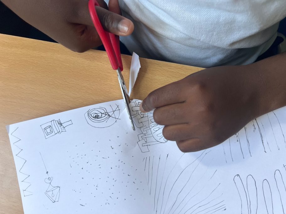Here you can see the pupils in action during the workshop, some of their finished designs and how I have turned those designs into the final mural.