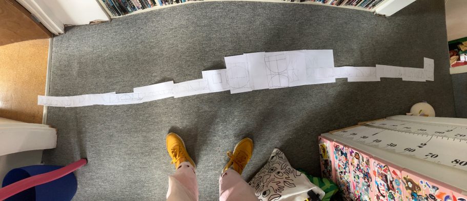 Here you can see some of the pupils designs and some of my rough ideas coming together. The area is huge, 56 meters square. I have divided the design into meter square sections so we can highlight as many pupils ideas as possible.